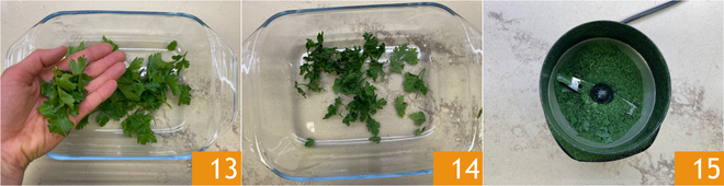 Agora distribua a salsa, lavada e seca, em uma assadeira para micro-ondas 13 e cozinhe a 800W por 30 segundos de cada vez até que esteja completamente seca; levará de 2 a 3 minutos 14. Deixe esfriar, depois triture com um moedor de café para obter um pó fino (alternativamente, você pode usar uma faca) 15. Reserve.