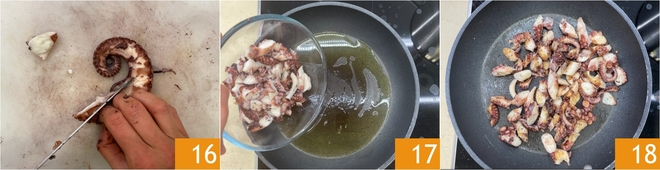 Retome o polvo agora frio e corte-o diagonalmente para obter losangos aproximadamente do mesmo comprimento dos paccheri 16. Aqueça um pouco de azeite em uma frigideira, adicione o polvo 17 e salteie em fogo médio por cerca de 5 a 6 minutos. Quando estiver bem dourado 18, reserve.