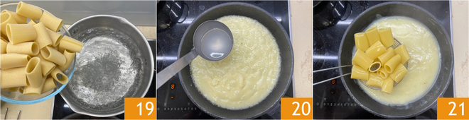 Cozinhe os paccheri em água fervente salgada 19. Enquanto isso, coloque o creme de batatas na mesma frigideira onde cozinhou o polvo, aqueça em fogo baixo e dilua com uma concha da água de cozimento da massa 20. Escorra os paccheri al dente na frigideira com o creme de batatas 21, adicione mais um pouco de água de cozimento e misture delicadamente.