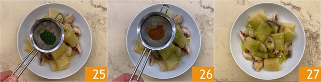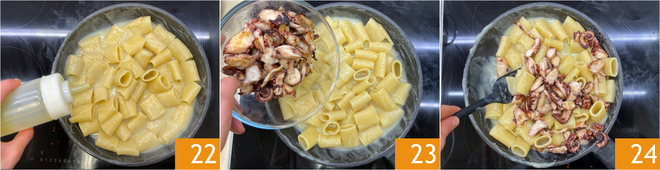 Neste ponto, finalize com um fio de azeite 22, adicione o polvo 23 e misture bem tudo 24.