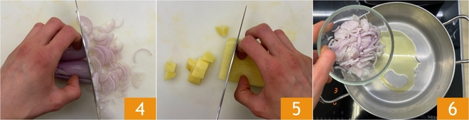 Enquanto isso, prepare o creme de batatas: descasque e pique a cebola echalote 4, depois descasque as batatas e corte em cubos de 2 cm 5. Coloque a cebola em uma panela com um fio de azeite 6, salgue e deixe fritar em fogo médio-baixo por cerca de 5 minutos.
