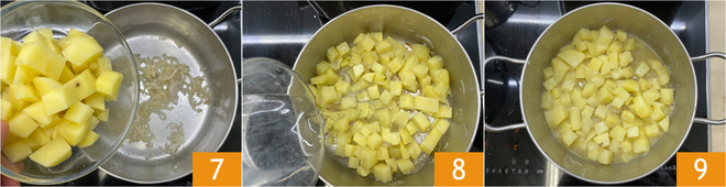 Depois de refogar, adicione as batatas 7 e refogue por mais 5 minutos. Cubra com água 8 e cozinhe por mais 10 a 15 minutos ou até que fiquem macias 9.