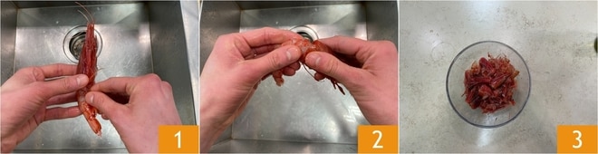 Para preparar os paccheri com provolone e camarões, comece pela limpeza dos camarões vermelhos. Com a ajuda das mãos, retire delicadamente as patas 1 e remova o casco. Em seguida, com uma leve pressão, retire a cabeça 2. Puxando delicadamente, deve sair também o intestino, caso contrário, você pode remover o filamento preto usando um palito de dente. Recolha em uma tigela todos os cascos e cabeças dos camarões 3.