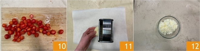 Enquanto isso, lave os tomatinhos e corte-os ao meio 10. Rale também a provolone defumada 11 e reserve 12.