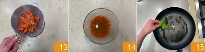 Após os 20 minutos, coe o fumet 13 para recolher o caldo em uma tigela 14. Coloque para ferver a água que será usada para cozinhar a massa e adicione sal. Agora, em uma frigideira, coloque um fio de azeite, um dente de alho e algumas folhas de manjericão 15.