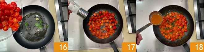 Deixe aromatizar e adicione os tomatinhos 16. Adicione sal 17 e salteie até murcharem, depois adicione o fumet 18 e cozinhe por 20 minutos.