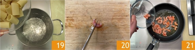 Quando faltarem cerca de 10 minutos, você pode mergulhar os paccheri na água, que agora terá atingido o ponto de fervura 19. Pegue os camarões e divida-os ao meio 20. Coloque um fio de azeite em uma frigideira, aqueça-a e adicione os camarões 21. Salteie brevemente, apenas por um ou dois minutos.