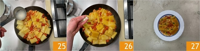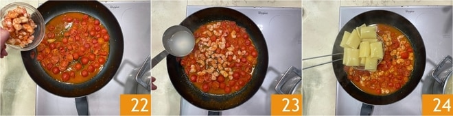 Transfira os camarões para a frigideira com os tomatinhos 22, adicione uma concha de água de cozimento 23 e os paccheri que você terá escorrido al dente 24.