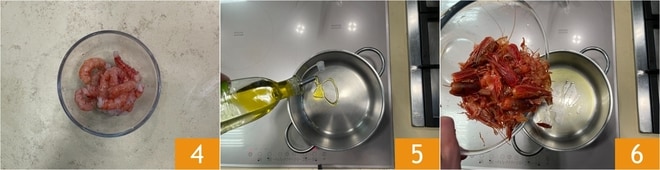 Em outra tigela, coloque os camarões limpos 4 e coloque-os na geladeira bem cobertos até o uso. Prepare um fumet rápido. Em uma panela, coloque um fio de azeite e os restos dos camarões 6.