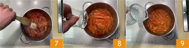 Toque bem, esmagando-os com uma colher de pau 7. Após 3 minutos, adicione o vinho branco 8 e quando a parte alcoólica tiver evaporado, adicione também 300 g de água 9. Cozinhe por cerca de 20 minutos.