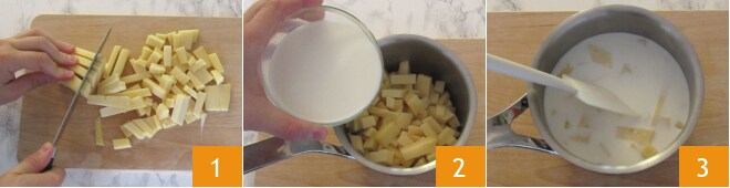 Para preparar os paccheri com radicchio e fonduta de fontina, comece pela fonduta: remova a crosta do queijo e corte-o em cubos bem pequenos 1, depois transfira para uma panela e adicione o leite 2. Deixe descansar à temperatura ambiente por cerca de 2 horas ou até que o queijo fique macio e quase gelatinoso 3.
