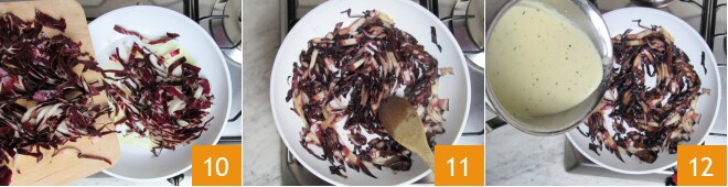 Enquanto isso, aqueça um fio de azeite em uma frigideira, adicione o radicchio 10 e deixe murchar por cerca de 5 minutos 11, depois desligue o fogo. Quando a fonduta estiver pronta, despeje-a ainda quente na frigideira com o radicchio 12.