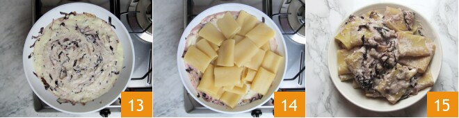 Misture bem para integrar o radicchio à fonduta 13, depois escorra os paccheri e adicione-os à frigideira 14. Misture, ajuste o sal e a pimenta, e sirva imediatamente seus paccheri com radicchio e fonduta de fontina 15!