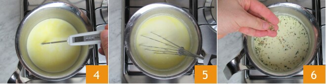 Depois do tempo de imersão, coloque a panela no fogo em chama baixa: para garantir um bom resultado, use um termômetro para verificar se o leite atinge uma temperatura entre 65°C e 75°C 4. Misture constantemente com um batedor para integrar o composto de forma homogênea 5, depois adicione o alecrim picado e o orégano 6.