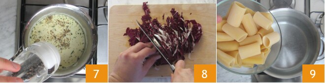 Tempere com a pimenta 7 e continue mexendo em fogo baixo: a fonduta deve cozinhar por cerca de 10-15 minutos, até que todo o queijo derreta e atinja uma consistência densa. Enquanto isso, corte o radicchio em tiras 8 e coloque uma panela de água no fogo para ferver e salgar. Despeje os paccheri na água fervente 9 e cozinhe pelo tempo indicado na embalagem.