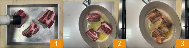 Para preparar os paccheri com costela à genovesa, comece salgando generosamente a carne 1, depois doure-a em azeite de oliva extra virgem em uma panela grande 2 3.