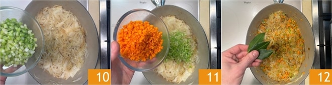 Adicione o aipo 10 e as cenouras 11, depois aromatize com as folhas de louro 2.