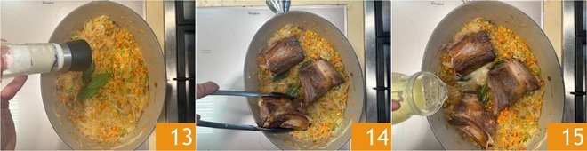 Tempere com sal 13 e pimenta do reino e deixei cozinhar em fogo baixo por cerca de 10 minutos, cobrindo com uma tampa para favorecer o cozimento das cebolas. Uma vez prontas, coloque a carne de volta na panela 14 e adicione o vinho branco 15.