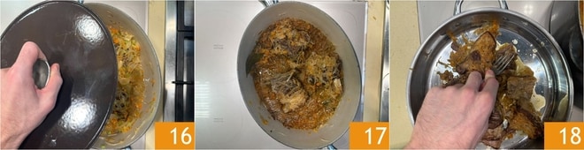 Deixe cozinhar tudo por cerca de 4-5 horas em fogo muito baixo com a tampa, até que a carne fique macia e comece a se soltar do osso 17. Neste ponto, retire a carne da panela e desfie-a 18, em seguida ajuste o tempero conforme seu gosto.