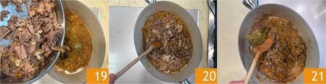 Junte a carne desfiada ao molho de cebolas 19, misture para pegar sabor 20 e elimine o louro 21.