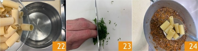 Enquanto isso, cozinhe os paccheri em bastante água salgada pelo tempo indicado na embalagem 22. Enquanto isso, pique manjerona, salsinha e cebolinha 23. Escorra os paccheri alguns minutos antes do final do cozimento e junte-os ao molho 24.