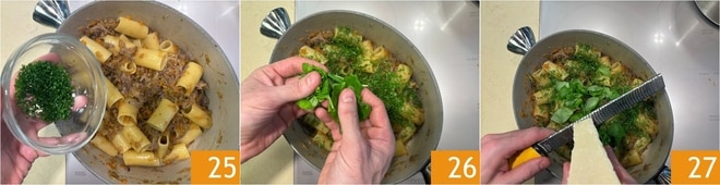 Aromatize com as ervas picadas 25 e rasgue manualmente o manjericão 26. Complete com o Parmigiano Reggiano DOP ralado 27.