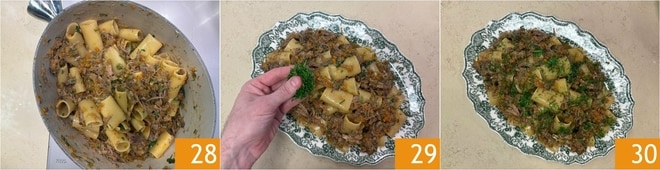 Misture para integrar 28 e sirva imediatamente seus paccheri com costela à genovesa adicionando ainda ervas aromáticas a gosto 29 30!