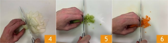 Enquanto a carne cozinha, descasque e fatie as cebolas 4, depois limpe e corte o aipo 5 e as cenouras em cubos 6.