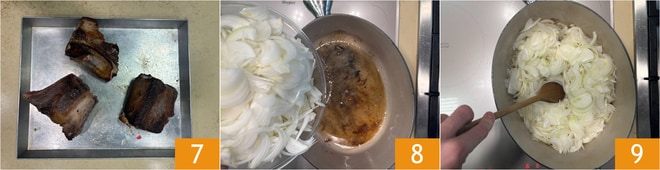 Quando a carne estiver bem caramelizada, retire-a da panela e reserve 7. Na mesma panela, adicione as cebolas 8 e deixe pegar sabor por alguns instantes 9.