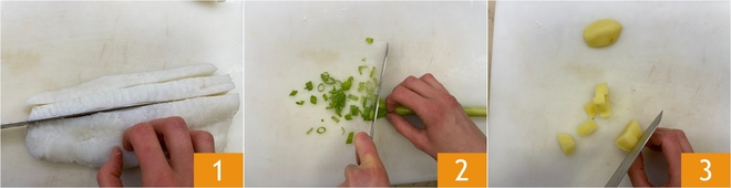 Para preparar os paccheri recheados com bacalhau sobre fondue de queijo, comece pela limpeza do peixe: coloque o bacalhau dessalgado sobre uma tábua de cortar e remova cuidadosamente a pele com a ajuda de uma faca afiada. Remova eventuais espinhas com uma pinça, depois corte o bacalhau primeiro em tiras 1 e depois em cubos regulares. Limpe a cebolinha removendo a base e a parte verde mais dura, depois corte em rodelas finas 2. Descasque as batatas e corte-as em cubos 3.