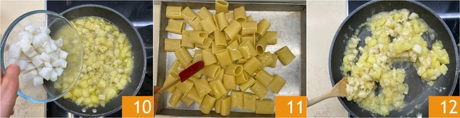 Quando as batatas estiverem macias, adicione o bacalhau 10 e continue cozinhando por mais 5-6 minutos, mexendo delicadamente. Enquanto isso, os paccheri também estarão prontos, então escorra-os em uma assadeira e tempere com um pouco de azeite para não grudarem, depois deixe esfriar 11. Quando o bacalhau estiver macio, desligue o fogo e reserve 12.