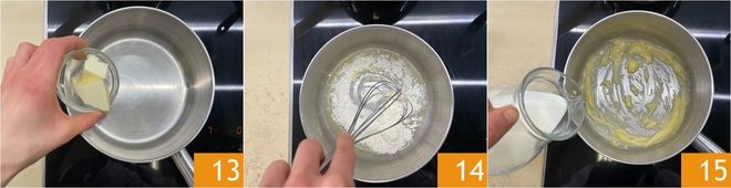 Enquanto isso, prepare o fondue: em uma panela com fundo grosso, derreta a manteiga em fogo baixo 13, depois adicione a farinha e mexa com um batedor 14 até obter uma mistura homogênea. Adicione o leite quente aos poucos 15.