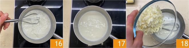 Continue mexendo 16 até que o molho béchamel esteja liso e bem espesso 17. Desligue o fogo e adicione o Asiago ralado 18.