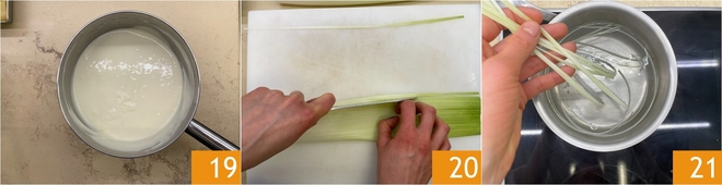 Misture até derreter completamente 19. Agora, corte fios finos e regulares do alho-poró 20 e escalde rapidamente em água fervente para amolecê-los 21.