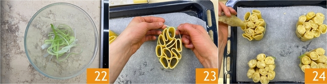 Escorra os talos e deixe esfriar 22. Você está pronto para montar o prato: em uma assadeira forrada com papel manteiga, organize os paccheri verticalmente formando 4 montinhos regulares de cerca de 10 peças cada. Amarre os paccheri com os talos de alho-poró 23. Transfira o recheio de batatas e bacalhau para um saco de confeitar sem bico e recheie os paccheri um a um até a borda 24. Transfira a assadeira para o grill do forno e gratine por cerca de 5 minutos.