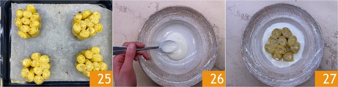 A superfície deve estar levemente dourada e crocante 25. Neste ponto, você pode servir: distribua algumas colheres de fondue no fundo do prato 26, depois coloque no centro um montinho de paccheri recheado. Seus paccheri recheados com bacalhau sobre fondue de queijo estão prontos para serem servidos bem quentes 27!