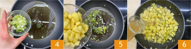 Aqueça um fio de azeite em uma frigideira grande, adicione a cebolinha junto com as folhas de tomilho 4 e deixe murchar suavemente em fogo médio. Adicione as batatas 5, misture para dar sabor e doure brevemente, depois cubra com o caldo de legumes quente 6.
