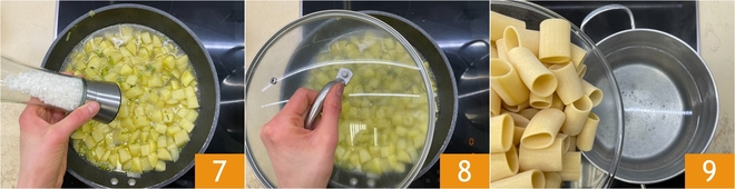 Adicione sal 7 e pimenta, cubra com a tampa 8 e cozinhe por cerca de 15 minutos. Agora, leve água salgada abundante para ferver e cozinhe os paccheri al dente 9, tomando cuidado para não quebrá-los.