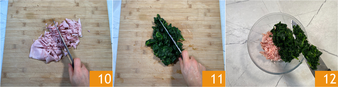 Pique grosseiramente o presunto cozido com uma faca 10, depois faça o mesmo com os espinafres bem escorridos 11. Misture o presunto e os espinafres em uma tigela e adicione uma pitada de pimenta 12.