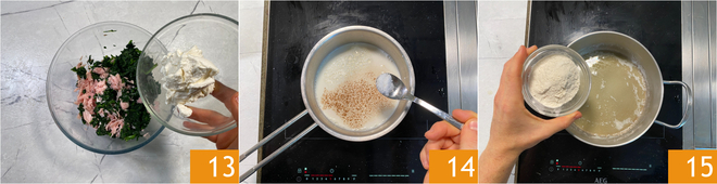 Adicione também a ricota 13 e misture tudo. Reserve o recheio e dedique-se ao molho branco: em uma panela, aqueça o leite com o sal e a noz-moscada 14. Em outra panela, derreta a manteiga e depois adicione a farinha 15.