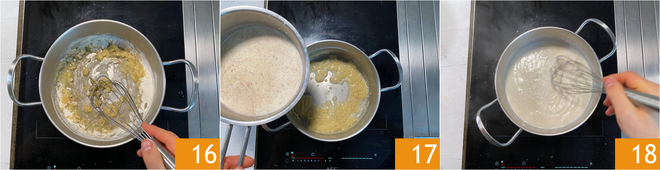 Misture rapidamente com um batedor para obter o roux 16, depois adicione o leite quente 17 e continue misturando até obter um molho macio e denso 18.