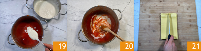 Despeje o molho branco ainda quente no molho de tomate 19 e misture bem 20. Agora você está pronto para montar os pacotinhos: corte as folhas de massa fresca ao meio no sentido do comprimento 21.