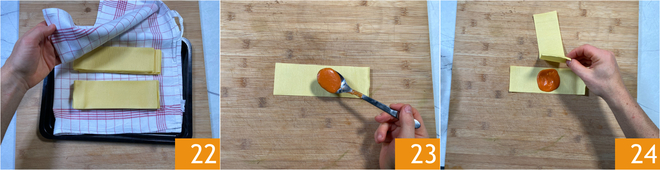 Pegue 2 tiras e mantenha as outras cobertas com um pano de prato para não secarem 22. Despeje um pouco de molho no centro da primeira tira 23, depois sobreponha a segunda em perpendicular, formando uma cruz 24.