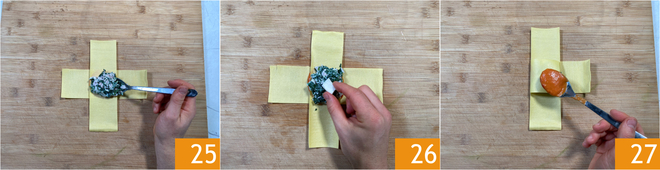 Coloque uma colherada de recheio no centro 25, depois adicione um cubo de muçarela 26. Agora dobre a primeira aba em direção ao centro e adicione mais um pouco de molho, que ajudará as folhas a aderirem 27.