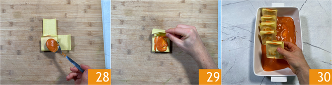 Dobrar também a segunda aba e acrescente mais molho 28. Continue assim, alternando massa e molho, até formar um pacotinho quadrado 29; no total, você obterá 15 pacotinhos. Espalhe o fundo de uma assadeira de 30x20 cm com uma camada de molho e disponha os pacotinhos dentro, à medida que forem ficando prontos 30.