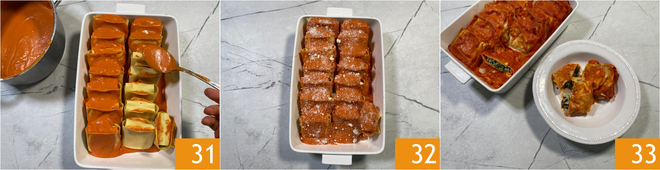 Espalhe o molho restante sobre os pacotinhos, certificando-se de cobrir bem também os lados 31. Finalmente, polvilhe com o queijo ralado e asse em forno estático pré-aquecido a 180°C por cerca de 30 minutos 32. Se desejar, você pode ligar o grill e continuar assando por alguns minutos para gratinar bem a superfície. Seus pacotinhos de lasanha estão prontos para serem servidos 33!