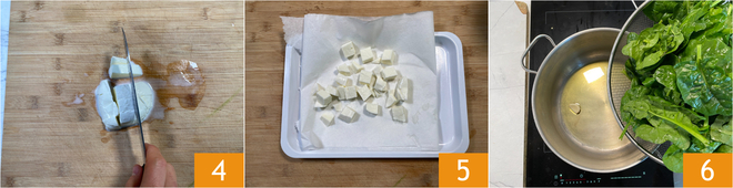 Corte a muçarela em 15 pedaços 4 e transfira para uma bandeja com papel absorvente para eliminar o excesso de líquido 5. Passe para os espinafres: em uma panela grande, refogue o óleo com o alho e depois adicione os espinafres limpos 6.