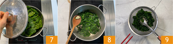 Salgue levemente, tampe a panela e cozinhe em fogo médio por cerca de 7-8 minutos 7. Uma vez murchos, retire o alho 8 e escorra bem os espinafres em uma peneira 9.