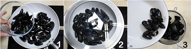 Para preparar a paella algherese lave e limpe bem os mexilhões (você pode seguir o procedimento indicado na ficha de cozinha “Como limpar e abrir mexilhões”), então coloque-os dentro de uma panela 1, cubra-os com uma tampa e deixe-os abrir em fogo alto por alguns minutos 2. Uma vez que todos os mexilhões estejam abertos, filtre o líquido do cozimento e reserve tudo 3.