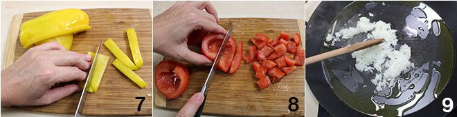 Lave o pimentão amarelo, retire as sementes e as nervuras internas, depois corte-o em tiras 7. Lave e limpe também os tomates, retire as sementes e corte-os em pedaços 8. Neste ponto, pique finamente a cebola e coloque-a, junto com 4-5 colheres de sopa de azeite de oliva extra virgem, na paellera apropriada (ou em uma frigideira antiaderente) com diâmetro de cerca de 32 cm 9.